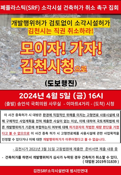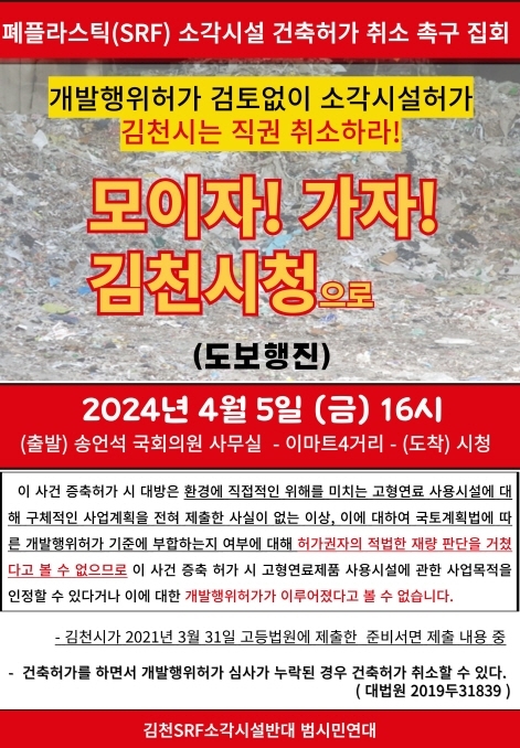 |  | | | ⓒ 김천내일신문 | | 김천 SRF소각시설반대 범시민연대에서는 4월 5일(금) 16:00~17:20 송언석 국회의원 사무실에서 이마트 4거리, 시청 앞까지 폐플라스틱 (SRF) 소각시설 건축허가 취소 촉구 집회 시위를 한다고 밝혔다.