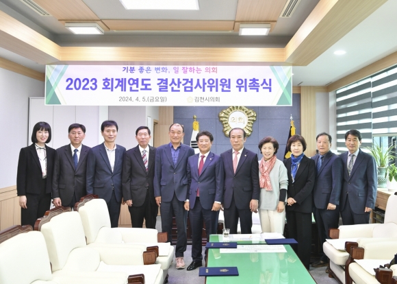 | 김천시의회(의장 이명기)는 4월 5일 의장실에서 제242회 임시회에서 선임된 2023회계연도 결산검사위원의 위촉장 수여식을 가졌다.