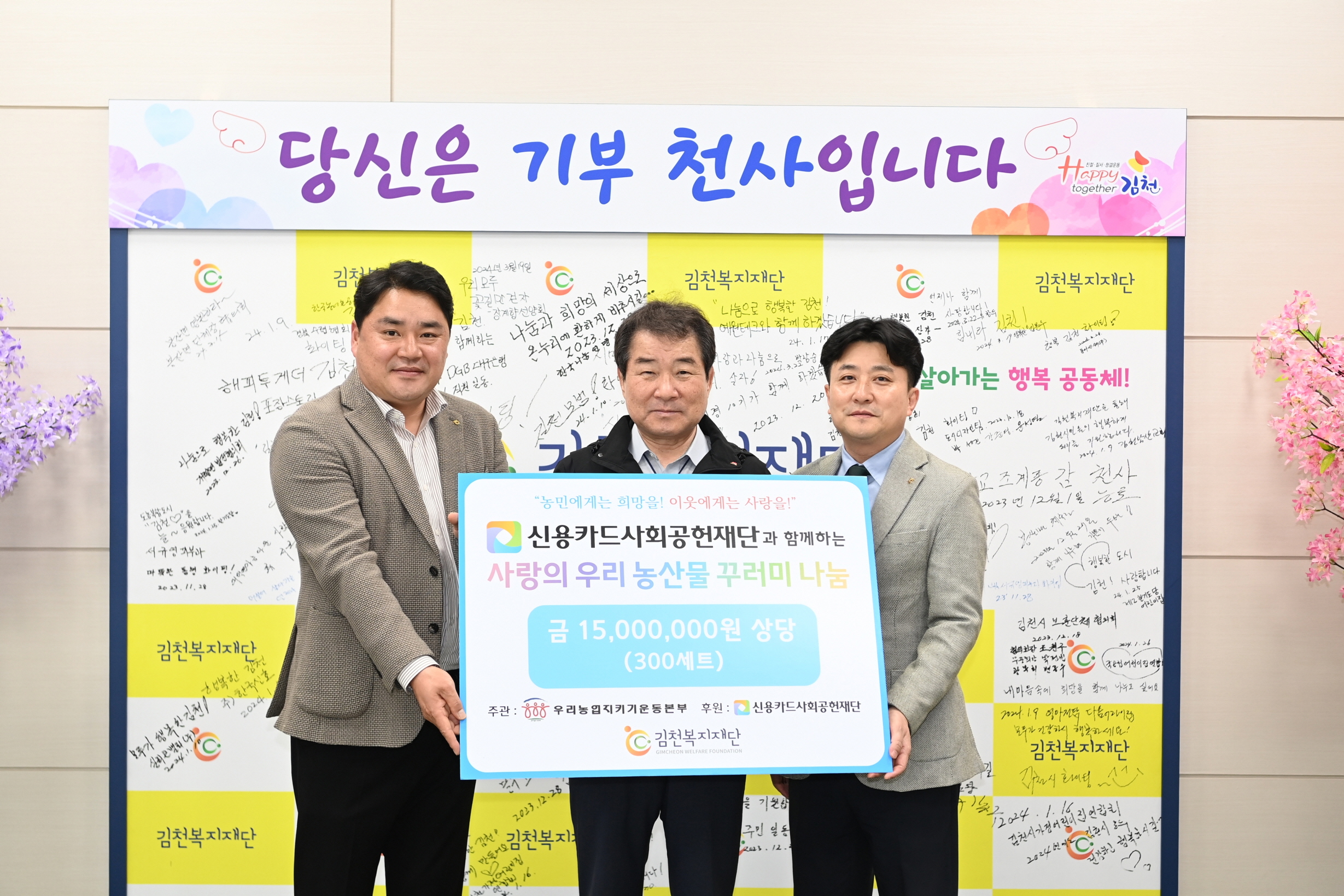 박기화 NH농협은행 김천시지부장은“품질 좋은 우리 농산물로 구성된 꾸러미가 지역의 어려운 이웃들의 건강과 행복에 작은 보탬이 되길 바란다”라며 “앞으로도 농업ㆍ농촌 부흥과 더불어 김천복지재단과 적극적인 협력을 통해서 사회공헌활동을 확대해 나가겠다”라고 말했다. 김충섭 김천복지재단 이사장은 “장바구니 물가 상승으로 어려움을 겪는 지역 이웃들을 위해 관심과 온정을 베풀어 주신 우리농업지키기운동본부에 깊이 감사드린다”라며 “이러한 선행과 선한 영향력이 지역사회에 널리 퍼져나갈 수 있도록 우리 시도 최선을 다하겠다”라고 말했다.