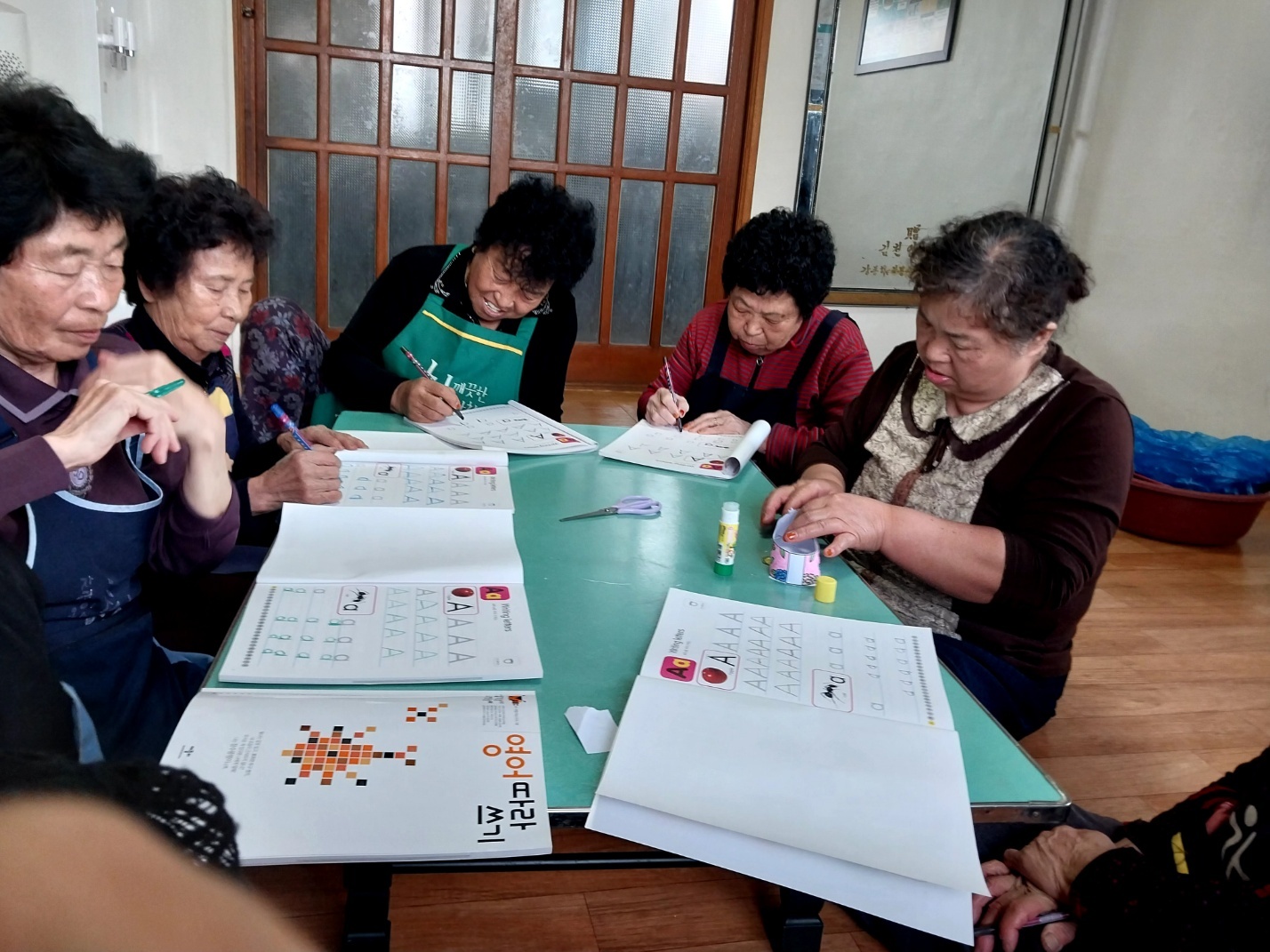 경로당행복선생님들의 지도하에 운영되는 『성인문해교육』 프로그램은 한글반 2개반 (초급, 중급), 영어 기초반으로 단계별로 구분하여 읽기와 쓰기 연습, 문장구조 학습, 단어학습, 발음 연습 등의 배움을 개별능력에 따라 제공하고 있다. 지난 4월 1일부터 개설하여 시작한 한글반과 기초영어반 수업에는 80개 경로당 350여명이 참여하여 처음에는 어르신들이 서로 쑥스러운 듯 눈치도 보고 했지만 지금은 행복선생님이 가르쳐 주는데로 한글자, 한글자를 손으로 짚어가면서 쓰고 읽으며 결연한 의지로 임하여 배움의 열의가 점점 뜨겁게 달아오르고 있다.