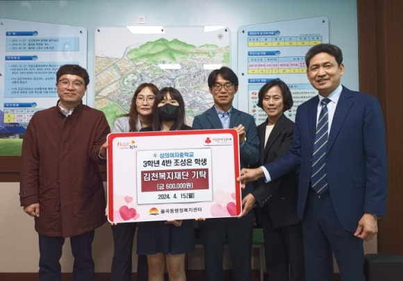 한편, 이날 열린 전달식에는 학생과 학부모를 비롯해 조성은 학생을 격려하고자 조용진 경상북도의원과 박근혜 김천시의회 행정복지위원장, 곽석진 율곡동 지역사회보장협의체 위원장 등 지역 인사들이 참석하여 의미를 더했으며, 조성은 학생의 후원금은 김천복지재단을 통해 지역 복지사업 등에 사용될 예정이다. |