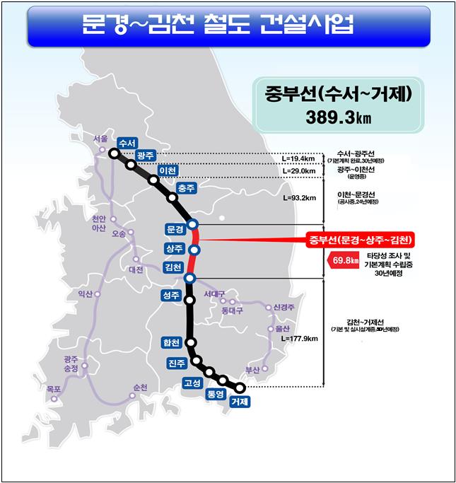 우선, 문경~김천간 철도 건설사업은 중부내륙(이천~문경)과 남부내륙철도(김천~거제) 간 단절구간을 연결하는 노선이며 수도권 접근성을 높여 수도권과 중ㆍ남부내륙간 지역균형발전에 기여할 핵심 철도망으로서, 본격적인 사업 추진을 위해 300억원을 요구했다.
