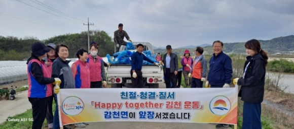 | 김천시 감천면 발전협의회(회장 오명석)와 생활개선회(회장 유정연) 40여 명은 봄을 맞아 지난 4월 16일 감천면 광기배수펌프장 부근의 도평뜰 주변에서 환경정화 활동을 펼쳤다.