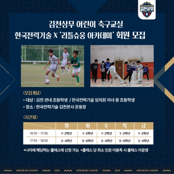 한편, 김천상무 ‘리틀슈웅 아카데미’ 입단 등 자세한 사항은 구단 공식 홈페이지 공지 사항에서 확인할 수 있으며, 선수운영팀(070-4105-4057)으로 전화 문의할 수 있다. |