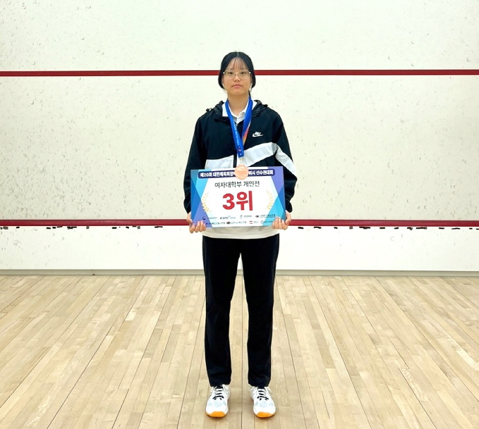 |  | | | ⓒ 김천내일신문 | | 김천대학교(총장 윤옥현) 스쿼시 조예림 선수가 제20회 대한체육회장배 전국 스쿼시 대회에 개인전에 출전하여 3위에 입상하였다고 22일 밝혔다. 스쿼시는 다소 비인기 종목이였지만 김천대학교에서 2021년 창단하여 정창욱 감독님을 필두로 꾸준한 훈련과 노력을 하여 개인전 3위에 입상하는 성적을 거뒀다.