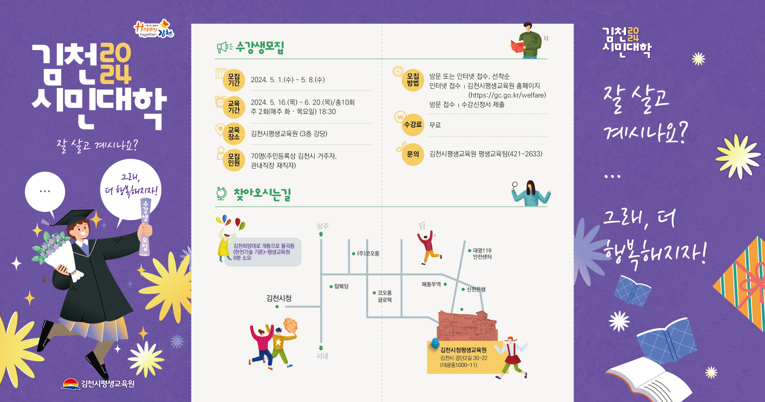 | 김천시평생교육원에서는‘잘 살고 계시나요?... 그래, 더 행복해지자!’라는 주제로「2024 김천시민대학」 수강생 70명을 5월 1일부터 8일까지 선착순 모집한다고 밝혔다.