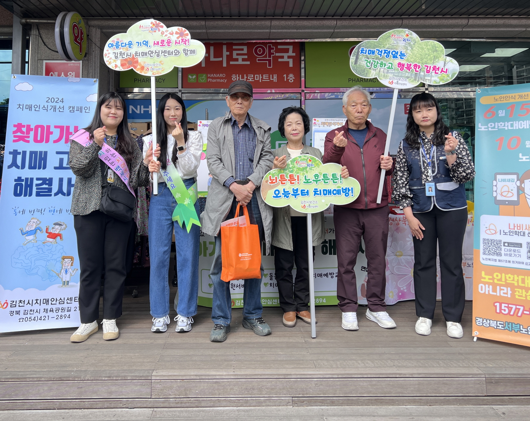 이날 김천시치매안심센터에서는 치매 인식개선 O/X퀴즈, 치매 예방수칙 3권 3금 3행 정보제공하고 치매 극복 희망 메시지 작성과 함께 치매조기검진 정보가 담긴 홍보물을 배부했다. 경상북도서부노인보호전문기관에서는 노인 학대 예방을 위한 홍보하고 기관정보가 담긴 리플릿 배부하는 시간을 가졌다.