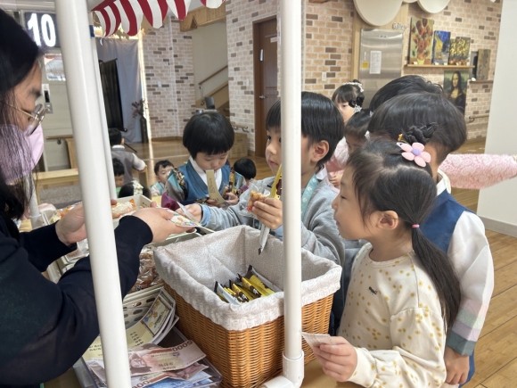 선생님과 함께 전통놀이의 규칙을 배우고 자유롭게 놀이에 참여한 아이들은 서로 경쟁하거나 양보하면서 즐거운 시간을 보냈다. 비석치기를 하던 만5세 김00은“성공할수록 더 어려워지는데 그래도 재밌어요!”라고, 만3세 박00은“손톱 예뻐진거 엄마한테 자랑해야지.”라고 말하며 느낌을 이야기하였다. 전통다과는 엽전을 이용해 선생님에게 직접 구입을 해서 먹어보면서 화폐의 개념에 대해서도 알아볼 수 있었다.