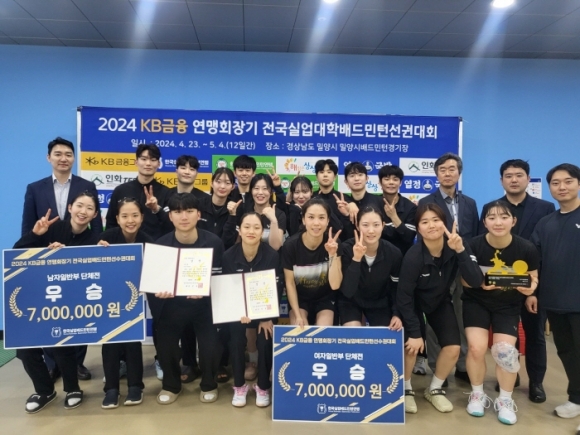 | 김천시청 배드민턴단은 지난 4월 25일 밀양시에서 펼쳐진 「2024 KB금융 연맹회장기 전국실업배드민턴선수권대회」단체전 결승전에서 남, 여팀 모두 우승을 차지하며 정상의 자리에 올랐다.