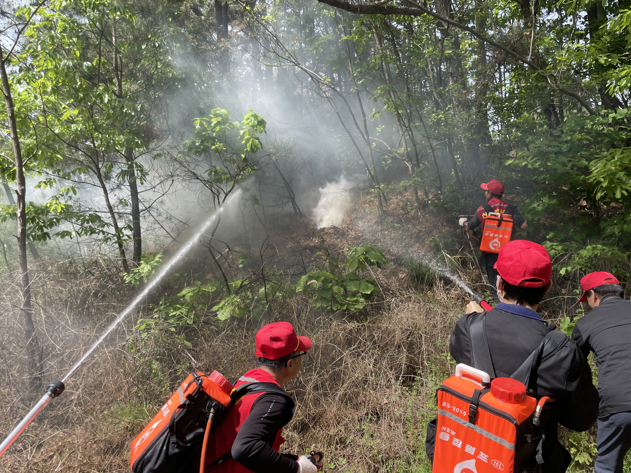 이번 진화훈련은 소방훈련용 연막탄을 사용하여 긴박한 산불 현장을 재현했으며 가상이지만 마치 실전과 같이 체계적이고 실감 나게 진행됐다. 훈련에 앞서 진화 장비와 초동 태세를 점검했고, 기계화 장비 사용법 숙지와 산불 진화 시 안전 수칙과 유의 사항에 대한 교육도 함께 이뤄졌다.