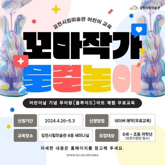 | 김천시립미술관에서 어린이날을 맞이하여 2024 생애주기별 교육프로그램(어린이대상)으로 <꼬마작가 : 물결놀이> 무료 체험 교육을 진행한다.