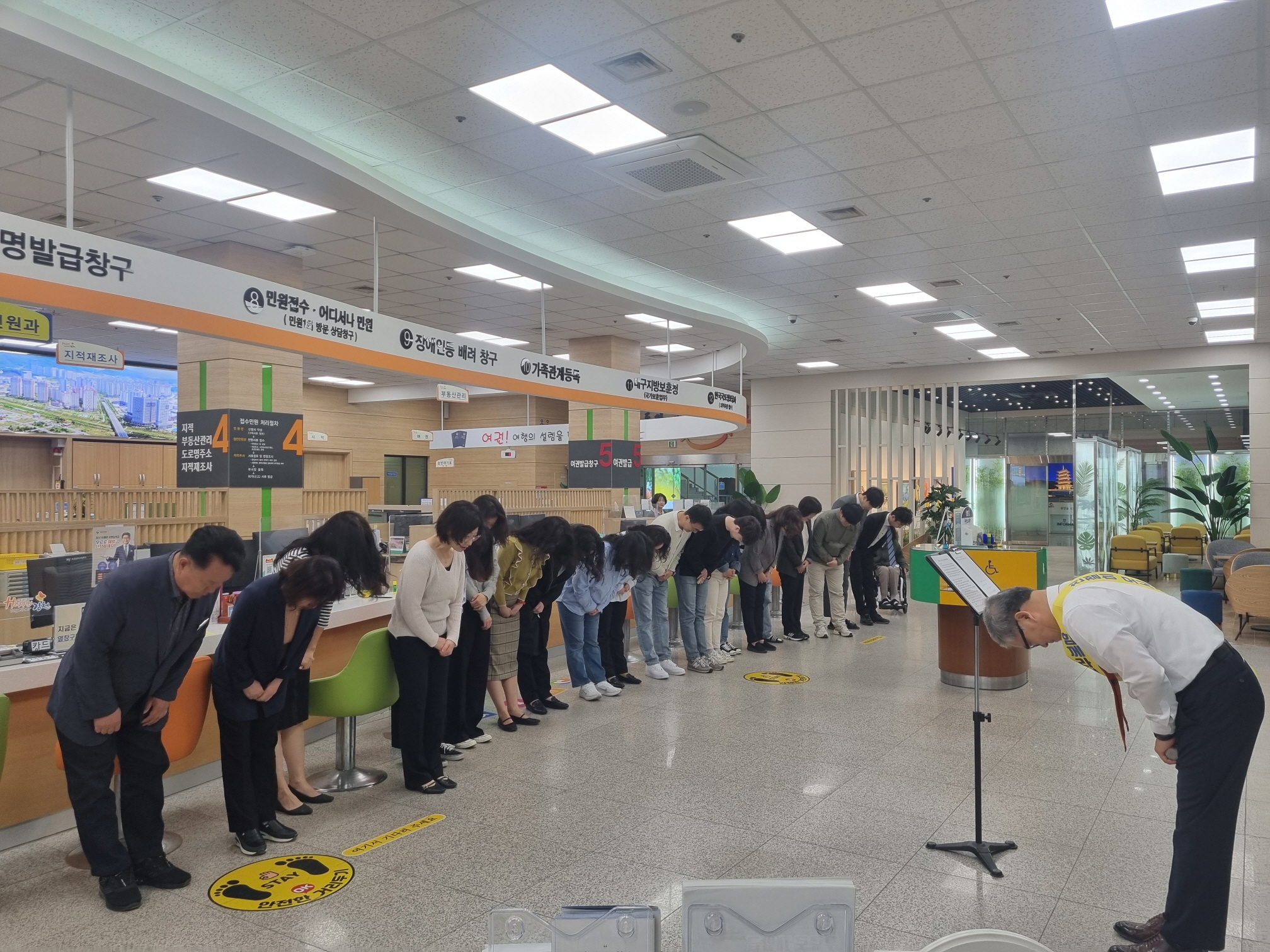 매월 운영하는‘친절 진단의 날’은 친절도 자가진단, 민원응대 사례관리 공유 등 역지사지의 마음으로 민원인의 입장에서 생각해 보는 시간이다. 민원실 전 직원은 매월 친절도 자가 진단 점검표를 작성하며 스스로 친절 마인드를 점검하고 미흡한 점은 보완해 민원 응대 능력 강화에 힘쓰고 있다.