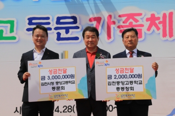 | 김천복지재단(이사장 김충섭)은 지난 4월 28일 김천중앙고등학교 총동창회(회장 김진국)로부터 성금 200만원, 김천시청 중앙고등학교 동문회(회장 전제등)로부터 성금 300만원을 전달받았다고 밝혔다.