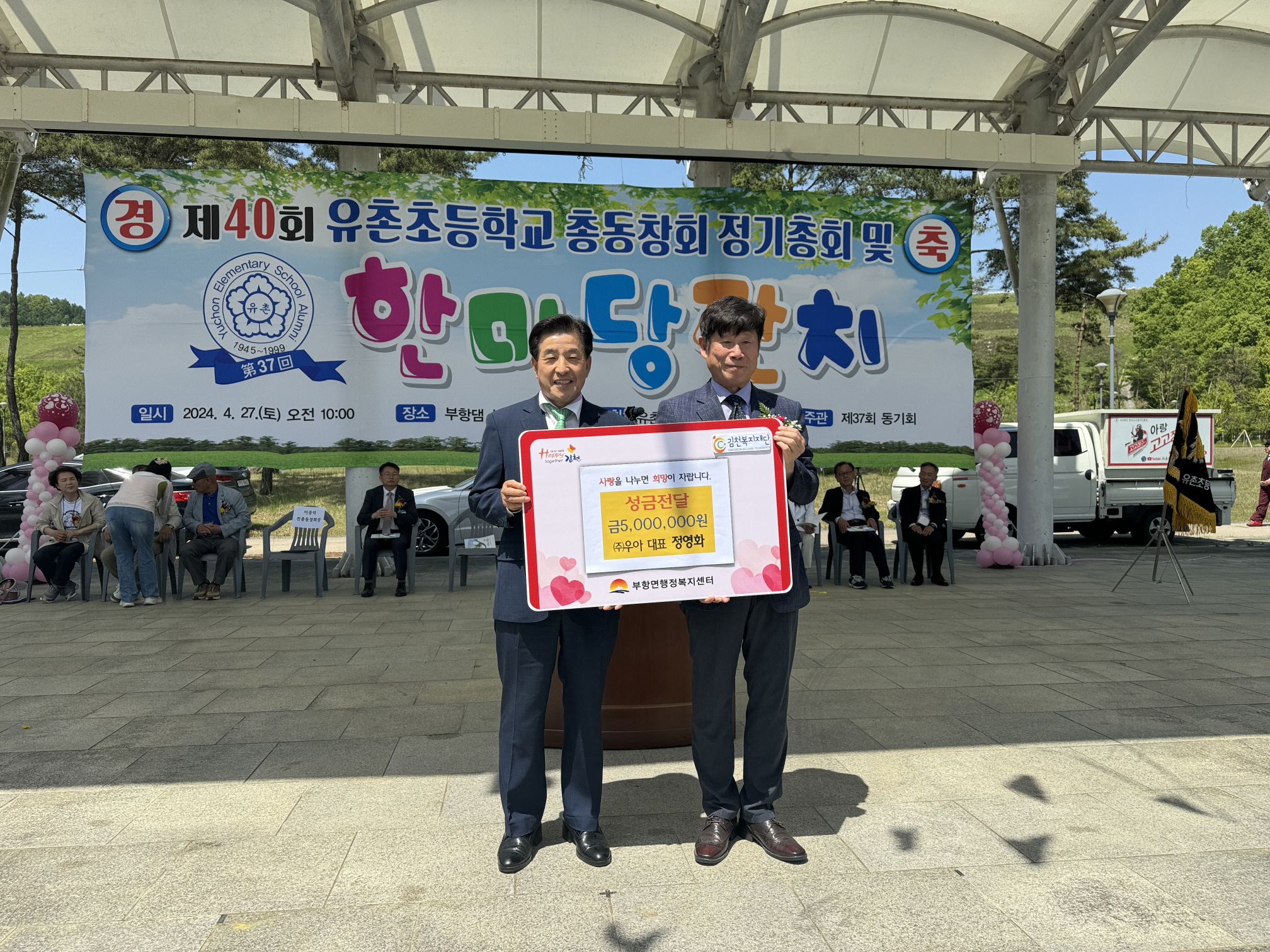 이날 전달식은 유촌초등학교 총동창회에서 주관하여 부항면 산내들공원에서 유촌초등학교 출신 출향민, 이주민 등 300여 명이 모인 가운데 이뤄졌다.