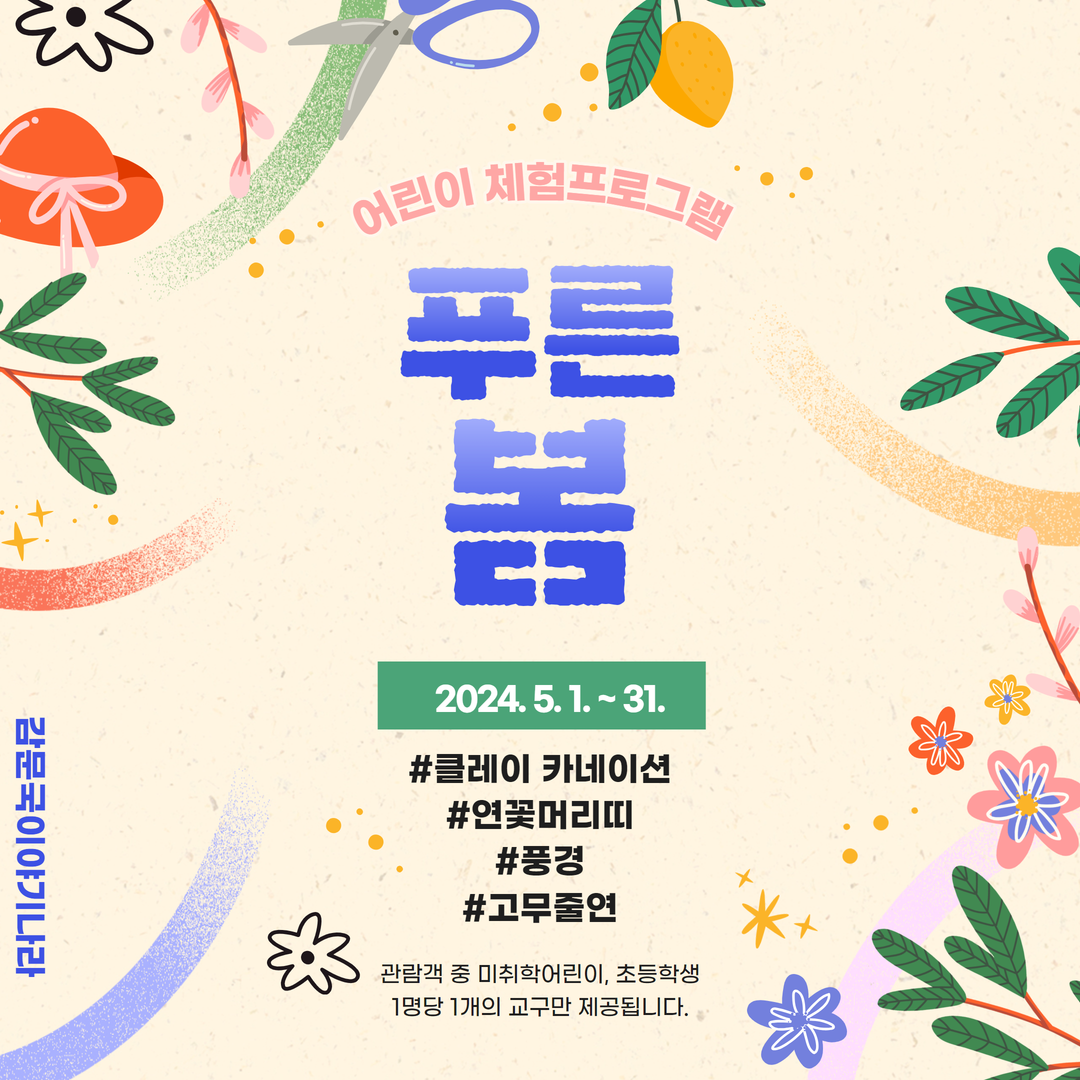 이번에 신설된 어린이 체험프로그램 ‘푸른 봄’은 가정의 달 내 기념일인 어린이날, 어버이날, 부처님오신날, 세계인의 날 등의 설명 카드를 제공하고, 준비된 교구 중 하나를 선택하여 만들어 볼 수 있는 행사이다. 교구는 클레이 카네이션, 연꽃 머리띠, 풍경, 고무줄 연 중 고를 수 있다.