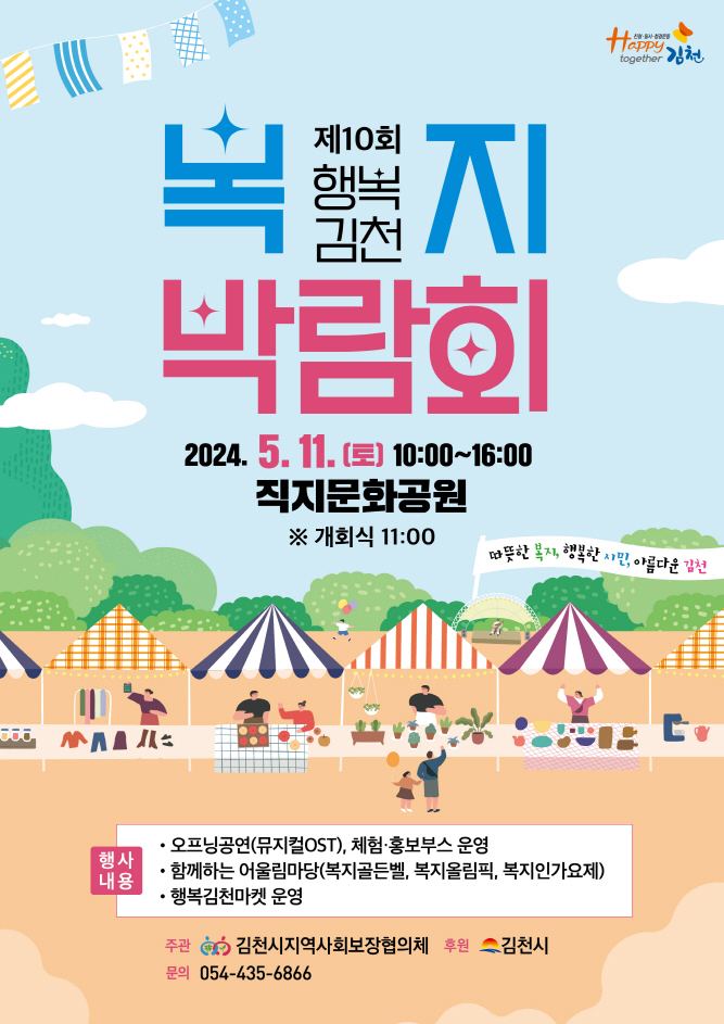 | 김천시(시장 김충섭)가 주최하고 김천시지역사회보장협의체(공동위원장 이은직)가 주관하는 『제10회 행복김천 복지박람회』가 5월 11일 대항면 직지문화공원에서 개최된다.