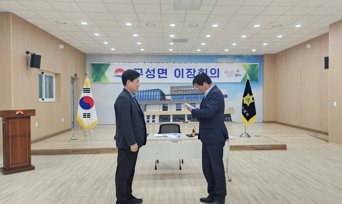 이장협의회 김은식 회장은 “기초생활거점 조성 사업으로 면민들의 숙원사업이었던 구성면 행정복지센터 준공을 위해 밤낮으로 힘써주신 김경민 부면장님께 감사드린다.”라며 “이번 감사패 전달을 통해 구성면민 모두를 대신하여 고마운 말씀을 전하고자 한다.”라고 말했다.