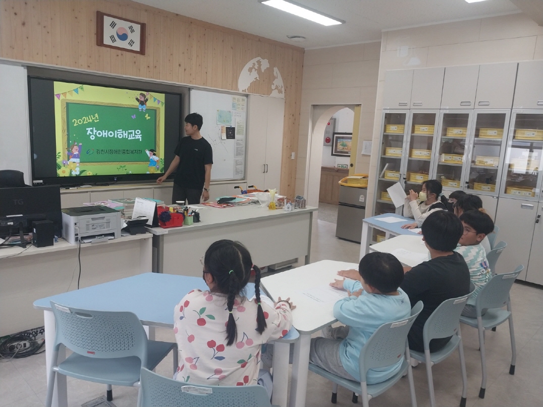 김천시장애인종합복지관에서 장애이해교육을 위해 교육강사가 직접 내교하여 학생들에게 강의가 실시되었다. 먼저 장애인에 대한 정의와 우리나라의 장애유형 및 대한민국 인구 중 장애인의 수에 대해 알아 보았다. 다음으로 실제 휠체어를 타고 직접 장애인 체험을 하였으며 마지막으로 눈에 안대를 하고 시각장애인용 지팡이를 이용하여 실제 교실 안을 다녀오게 하는 체험교육을 함께 실시하였다.