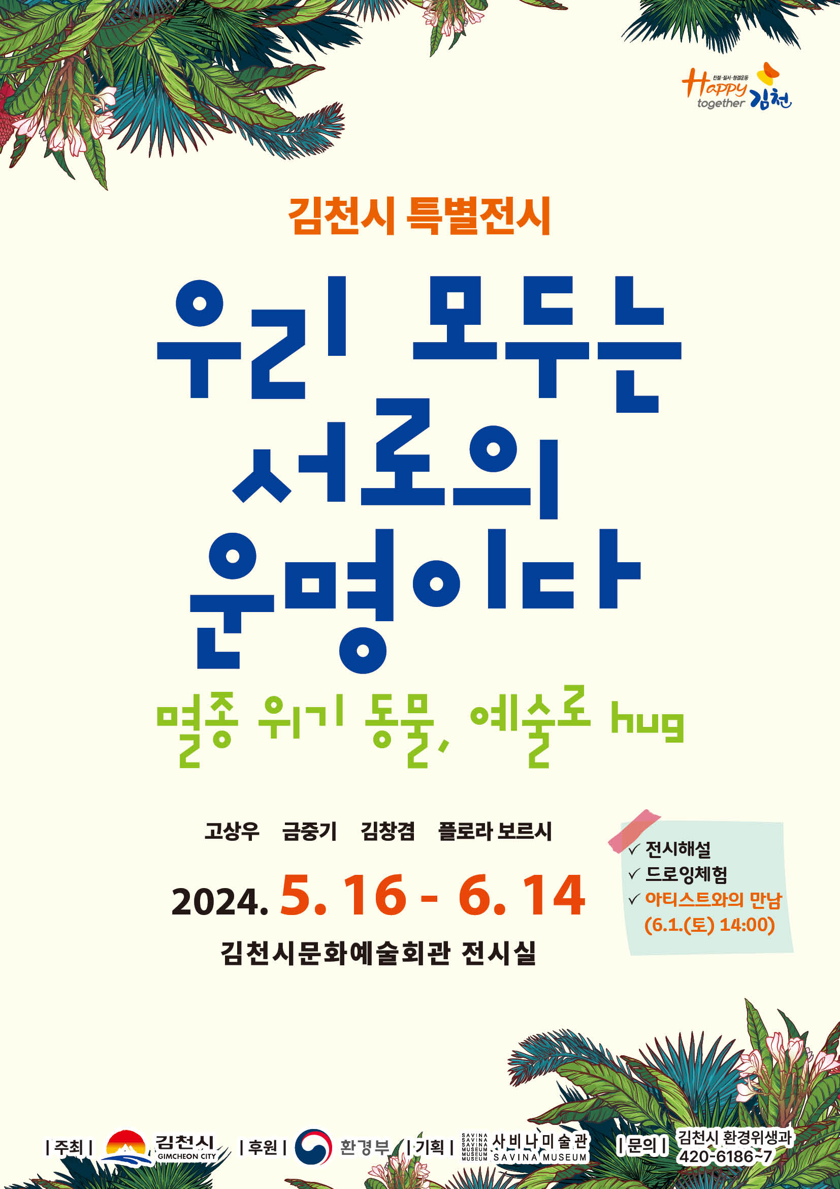 | 김천시는 「우리는 모두 서로의 운명이다 – 멸종위기동물, 예술로 HUG」전을 5월 16일부터 6월 14일까지 김천시문화예술회관에서 특별 전시한다.