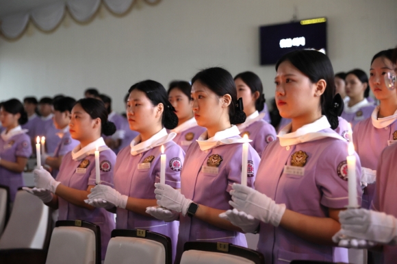 | 김천대학교(총장 윤옥현) 간호학과(학과장 최지연)는 5월 14일 제1보건과학관 4층 그레이스 홀에서 간호학과 2학년 재학생 120명을 대상으로 제13회 간호비전 선서식을 개최하였다.