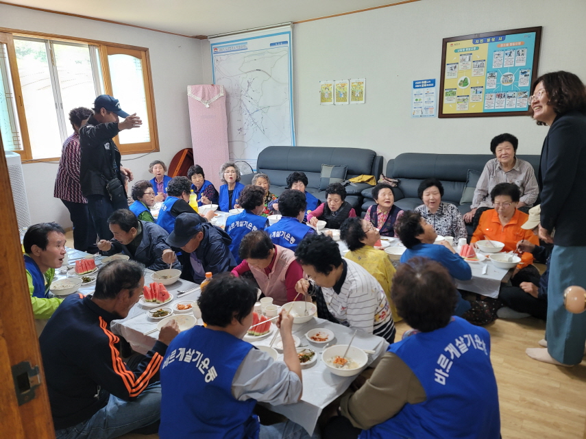 바르게살기운동 위원들은 아침 일찍 호동마을회관에 모여 재료를 다듬고 손수 음식을 만들었다. 본격적인 영농철이 시작됨에 따라 어르신들의 건강을 위해 닭백숙을 준비했으며, 많은 어르신이 방문해 마을회관을 가득 채워 주셨다. 닭백숙과 더불어 수박까지 든든한 한 끼 점심을 먹으면서 이야기꽃을 피우고 잠시나마 무더위를 식혔다.
