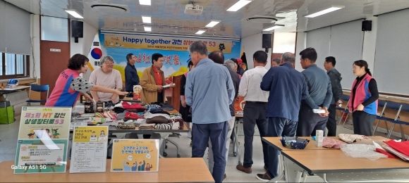 | 김천시 감천면(면장 이상진)에서는 지난 5월 16일 제1회 해피투게더 감천 상생장터로53 행사를 시작으로 연말까지 총 3회 개최한다고 밝혔다. 오늘 행사는 2023년 생활개선회(회장 유정연) 회원들이 가정에서 사용하지 않는 생활용품 등을 회원들끼리 사고파는 장터로 시작해 올해는 감천면 단체로 확대하게 됐으며, 판매금은 연말에 이웃돕기로 사용된다.