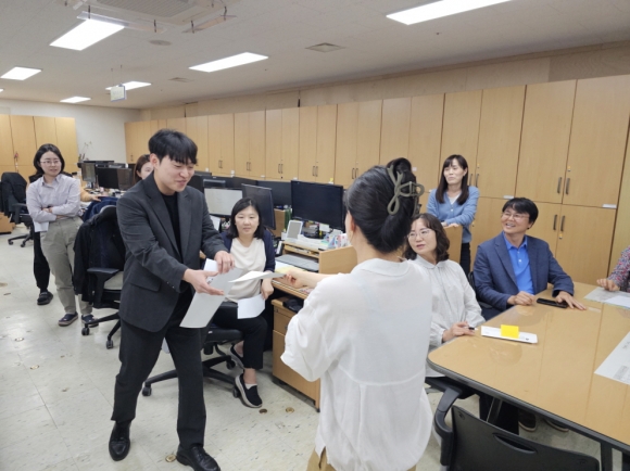 사무실 내 직원 간 소통을 활성화하고 경직된 조직문화 개선하기 위해 계획된 이번 ‘청렴 마니토 활동’은 복지기획과 전 직원이 동참해, 상대 마니토를 비밀스럽게 관찰하고 직장스트레스 대처 방법을 상대방과 공유하면서 수평적이고 활기찬 직장 분위기를 조성했다.