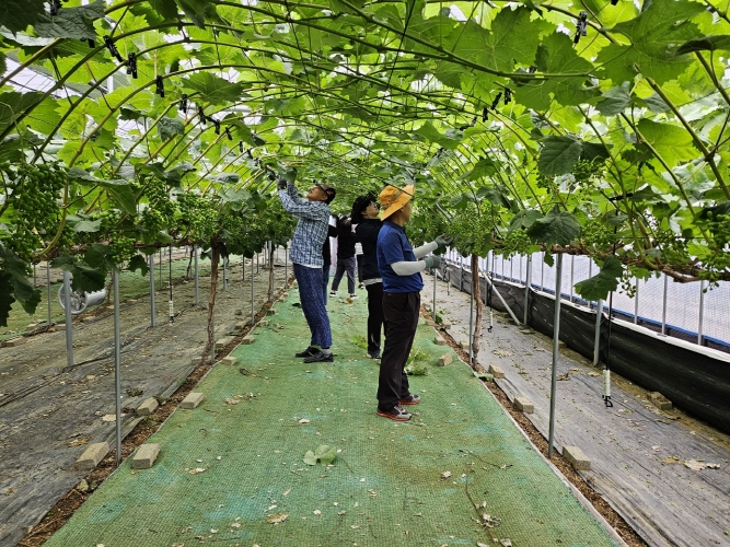 | 개령면(면장 임동환)은 5월 21일 직원 10여 명이 본격적인 봄철 농번기를 맞아 일손 부족으로 어려움을 겪고 있는 관내 포도 재배 농가를 방문해 포도 순 따기 작업을 지원했다.