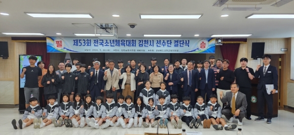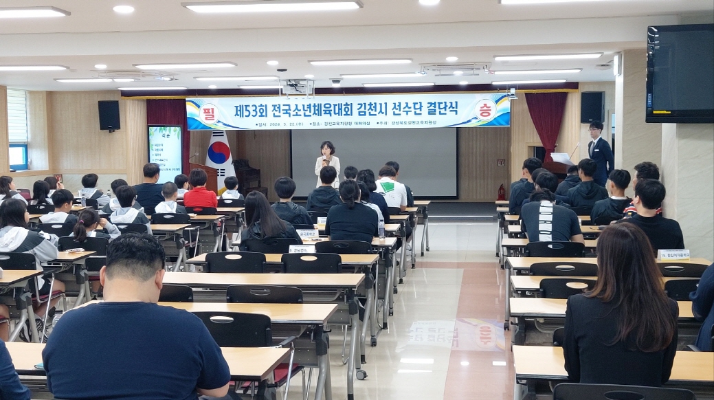 | 경상북도김천교육지원청(교육장 공현주)은 5월 22일 3층 대회의실에서 제53회 전국소년체육대회에 참여하는 선수들을 격려하고 결의를 다지는 결단식을 개최했다.