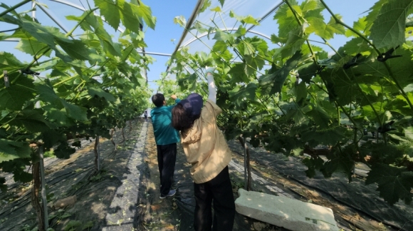 | 경상북도김천교육지원청(교육장 공현주)은 5월 23일 본격적인 영농철을 맞아 일손 부족, 인건비 상승 등 어려움을 겪고 있는 농가를 위해 30여명의 직원들이 참여해 김천시 대항면 소재 포도밭에서 농촌일손돕기를 실시하였다.