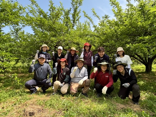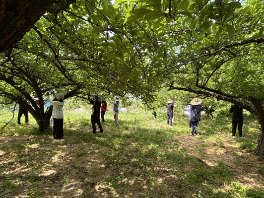 아침 일찍 농가를 방문해 농장주에게 간단히 자두 적과 교육을 받고, 서툴지만 정성을 다해 작업을 하며 구슬땀을 흘렸다.