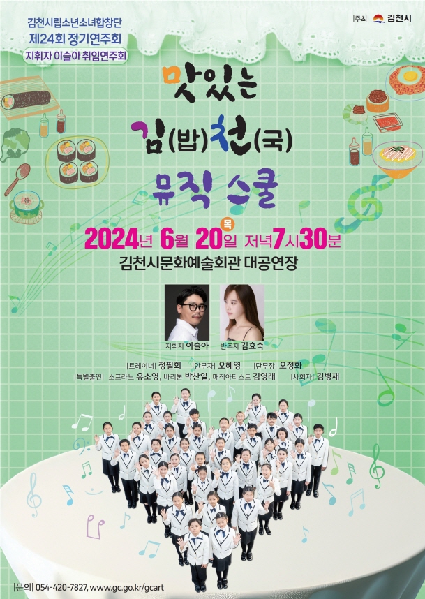 | 김천시 문화예술회관(관장 배정화)에서는 오는 6월 20일에 김천시립소년소녀합창단 제23회 정기연주회 “맛있는 김(밥)천(국) 뮤직 스쿨”을 개최한다.