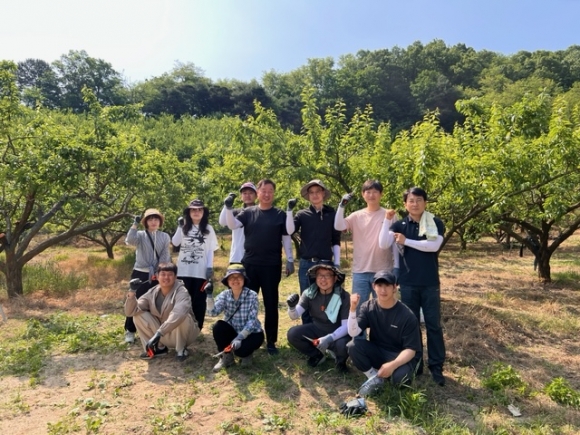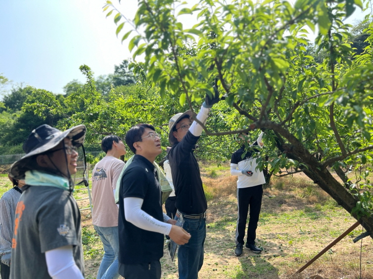 자두밭에 모인 직원들은 농장주로부터 과실 솎기 작업 대한 간단한 설명을 들은 뒤 구역을 나누어 작업을 했다. 서툰 농사일이었지만 보탬이 되고자 구슬땀을 흘렸다.