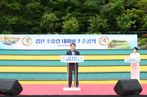 |  | | | ⓒ 김천내일신문 | | 김천시는 5월28일, 봉산면 광천리 1053번지 일원[추풍령휴게소(부산방향) 뒤편]에 추풍령 테마파크를 조성하고 김충섭 김천시장, 김상철 경상북도 문화관광체육국장, 이명기 김천시의회 시의장, 배병훈 한국도로공사 대구경북본부장, 장찬옥 한국교통안전공단 교통안전본부장, 이우청 경상북도 도의원, 봉산면 기관단체장 및 주민대표 등 지역주민이 참석한 가운데‘김천 추풍령 테마파크 준공식’ 행사를 가졌다.