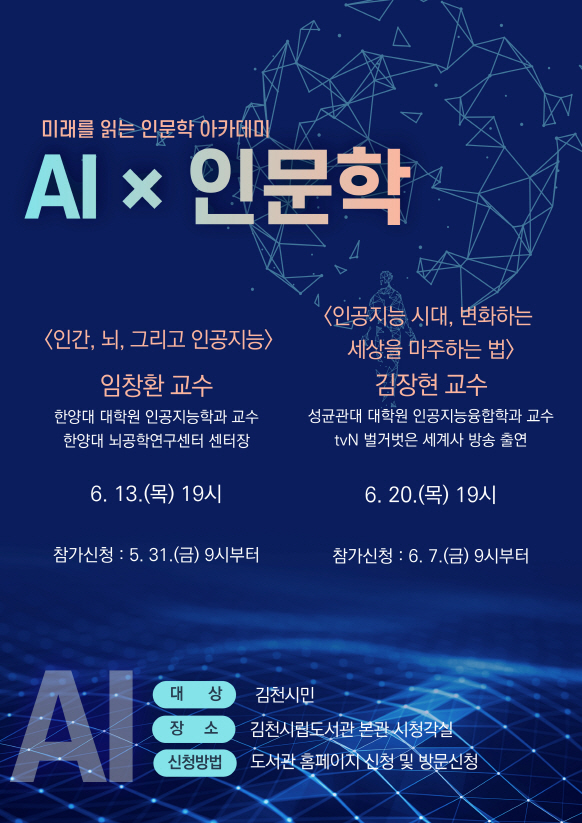 | 김천시립도서관(관장 이순영)은 인문학적인 관점에서 인공지능의 이해를 돕고, 미래 사회에 펼쳐질 인공지능 세상에 대비하고자 미래를 읽는 인문학 아카데미를 개최한다고 밝혔다. 강연은 AI×인문학이라는 주제로 6월 총 2회로 운영된다.