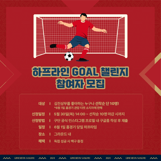 장내에서는 하프라인 골 챌린지 하프타임 이벤트가 진행된다. 사전에 선착순으로 모집한 참가자를 대상으로 하프라인에서 득점에 성공할 경우 김천상무 백구를 증정한다.