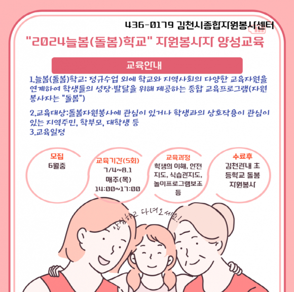 현재 (사)김천시종합자원봉사센터에서는 김천시 관내 초등학교의 늘봄 학교에서 초등학생들의 안전하고 편안한 돌봄 서비스를 받을 수 있도록 자원 봉사자를 꾸준히 양성할 계획이며 자세한 내용은 054. 436.1365/0179로 문의하면 된다. |