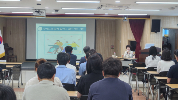 | 경상북도김천교육지원청(교육장 공현주)은 6월 3일 김천교육지원청 대회의실에서 전 직원들을 대상으로 사회적 장애인식개선 교육을 실시했다.