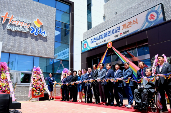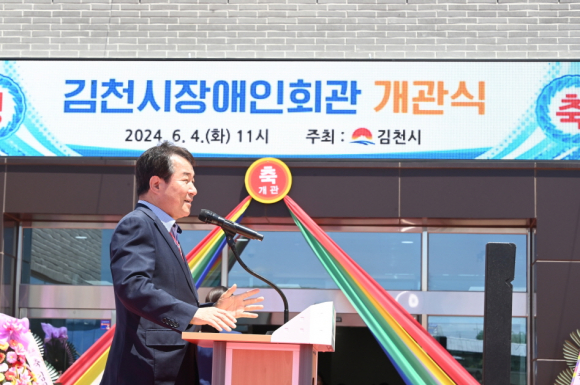 | 김천시는 6월 4일 민선 8기 ‘개인별 맞춤 복지’공약사업의 하나로 건립한 김천시장애인회관 개관식을 개최했다. 이날 개관식에는 김충섭 김천시장, 송언석 국회의원, 이명기 시의회 의장, 지역 도・시의원, 기관장과 지역주민 등 600여 명이 참석했다.
