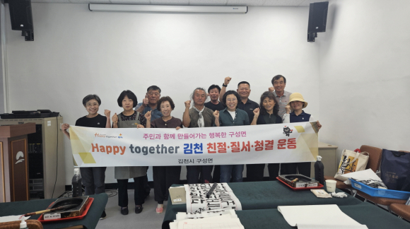 | 구성면(구성면장 이혜정)에서는 지난 6월 30일, 구성서예학당(대표자 홍덕수)을 대상으로 Happy Together 김천 운동을 홍보했다. 구성서예학당은 구성면민의 소양과 복지 향상을 위해 주민들로 이루어진 서예 동아리이며 매주 목요일 구성면 행정복지센터에서 활동을 가진다.