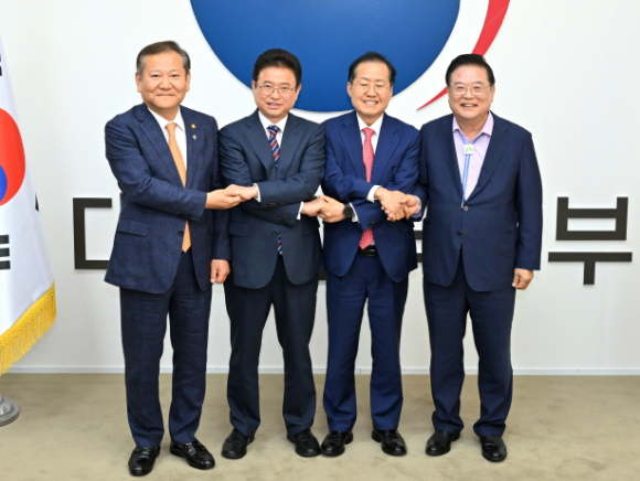 |  | | | ⓒ 김천내일신문 | | 정부서울청사에서 6월 4일 이상민 행정안전부장관, 우동기 지방시대위원장, 홍준표 대구광역시장, 이철우 경상북도지사가 한자리에 모여 대구·경북 통합 추진방안을 논의했다.