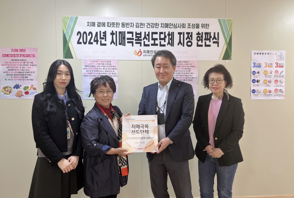 | 김천시치매안심센터는 치매 극복선도단체로 지정된‘한국치매 예방운동본부 김천지부’와 함께 치매 예방 활동을 전개할 계획이다. 한국치매 예방운동본부 김천지부는 올해 지부에 소속된 강사 전 직원이 치매 파트너 교육 및 파트너 플러스 교육을 수료하고, 지역주민의 치매 예방 활동을 함께 하고자 신규 치매 극복 선도단체로 지정받아 현판식도 함께 가지면서 첫걸음을 시작했다.