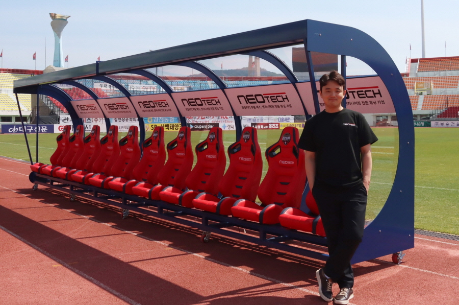 이 점을 줄곧 생각하는 이가 있었다. 김천시에 소재를 둔 국내 1위 자동차 튜닝 전문기업 네오테크의 이준명 대표다. 평소 축구에 진심인 그는 관내 프로축구팀인 김천상무프로축구단(대표이사 배낙호)의 경기를 챙겨보곤 했다. 경기를 보면서 프리미어리그를 비롯한 해외 유명 리그들의 잘 갖춰진 벤치들에 비해 기존 벤치 수준에 아쉬움을 느꼈다. 이 대표는 K리그1에서 순항하는 선수단에 그 수준에 맞는 벤치를 제공함으로써 선수단의 사기 진작과 컨디션 향상에 도움이 되고자 했다. 이준명 대표는 생각을 실천에 옮겼다.