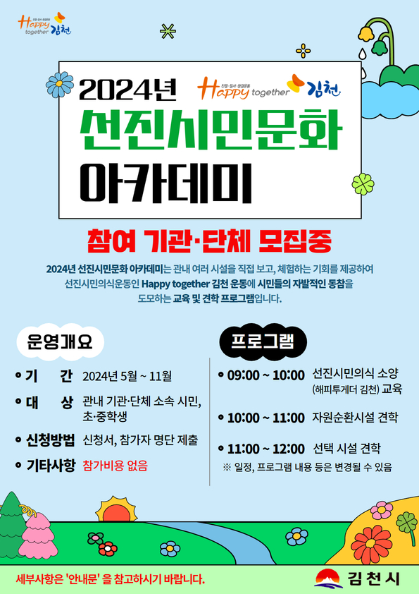 | 김천시에서 운영하는 ‘2024년 Happy together 김천 선진 시민문화 아카데미’에 대한 관내 기관, 단체, 학교의 관심이 높아지며, 관련 문의가 쇄도하고 있다.