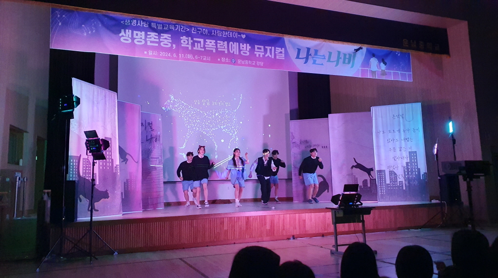 | 운남중학교(교장 전용희)는 ‘친구야, 사랑한데이’ 생명사랑 특별교육의 일환으로 6월 11일, 강당에서 3학년(199명)을 대상으로 생명존중, 학교폭력예방 뮤지컬 <나는 나비> 공연 관람 행사를 진행하였다.