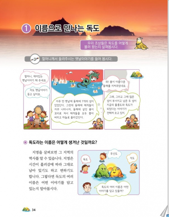 4학년 교재는 독도의 지리와 환경, 생태, 명칭의 변화와 지도 등 사료, 독도에 사는 사람들과 정부ㆍ지자체의 노력을 보여준다.