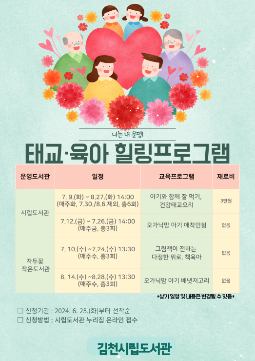 | 김천시립도서관(관장 이순영)은 오는 7월 9일부터 8월 28일까지 관내 예비 부모와 육아 부모를 대상으로 시립도서관과 작은도서관에서 태교·육아힐링 프로그램을 운영한다고 밝혔다. 이번 힐링 프로그램은 건강한 임신 기간 유지와 편안한 출산 분위기 조성을 위해 예비 부모와 육아 부모에게 심리적인 안정과 즐거운 여가활동은 물론, 육아에 도움이 되는 그림책을 활용한 태교 등 다양한 강좌를 개발해 운영될 예정이다.