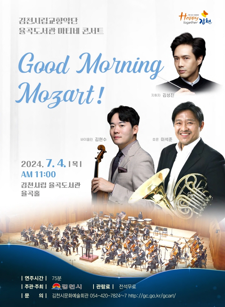| 김천시문화예술회관(관장 배정화)에서는 오는 7월 4일 목요일 오전 11시에 김천시립합교향악단 율곡도서관 마티네 콘서트「Good Morning Mozart!」를 개최한다. 마티네 콘서트는 대중이 이해하기 쉽고 익숙한 작품으로 주로 평일 오전 시간에 공연하는 것을 말하며, ‘11시 콘서트’, ‘브런치 콘서트’ 등의 명칭으로 사용되기도 한다. 이번 공연은 총 3곡이 연주된다. 첫 번째 곡은 「잘츠부르크 협주곡」 중의 바이올린 협주곡 제3번 G장조 K.216, 모차르트 자신이 「스트라부르크 협주곡」이라 부르고 있는 비교적 소규모이고 악상도 간단하지만, 풍부하고 아름다운 음의 색채와 정취에 넘쳐 있는 곡이다. 현재 수원시향의 객원 악장이자 국민대 교수인 바이올리니스트 김현수와 협연한다. 두 번째 곡은 모차르크가 호른 협주곡 가운데 처음 작곡된 것으로 추정되는 「호른 협주곡 2번」이다. 모짜르트는 격의 없이 지내고 있는 호른 주자 요제프 로이트게프를 위해 작곡하였다. 한국예술종합학교 교수인 호른 주자 이석준과 협연한다. 세 번째 곡은 모차르트 교향곡 제41번 「주피터」이다. 1788년 모차르트는 생활고와 건강 악화로 힘든 나날을 보냈다. 게다가 생후 6개월인 딸인 갑작스럽게 사망해 깊은 상심에 빠졌지만, 그는 이런 악조건 속에서도 작곡한 교향곡이다. 전체 4악장으로 구성되어 있으며, 시립교향악단이 1악장과 4악장을 연주한다. 배정화 문화예술회관장은 ‘시립교향악단은 올 4월에 예술의전당의 초청을 받아 공연할 정도로 전국에서 실력을 인정받았다. 시립교향악단의 수준 높은 공연을 많은 분이 오셔서 즐기시길 바란다’라고 말했다.