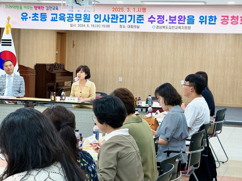 | 경상북도김천교육지원청(교육장 공현주)은 6월 19일 유ㆍ초등 교육공무원 30여 명이 참석한 가운데 인사관리기준 수정ㆍ보완을 위한 공청회를 개최했다.