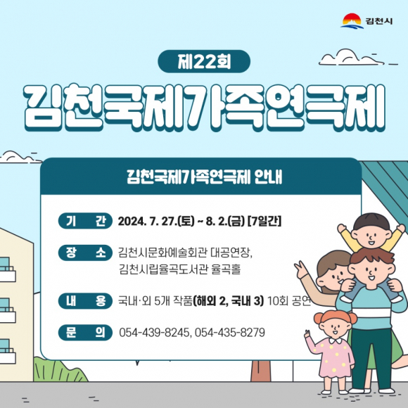| 김천시(시장 김충섭)는 제22회 김천 국제가족연극제를 7월 27일부터 8월 2일까지 7일간, 김천시문화예술회관 대공연장, 김천시립율곡도서관 율곡홀에서 개최한다고 밝혔다.